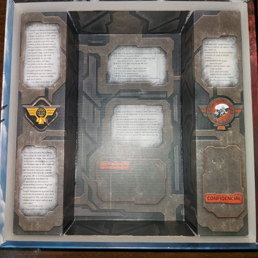 Coloquei o manual em cima de tudo. Já serve como um divisor e proteção do tabuleiro principal. Cry Havoc