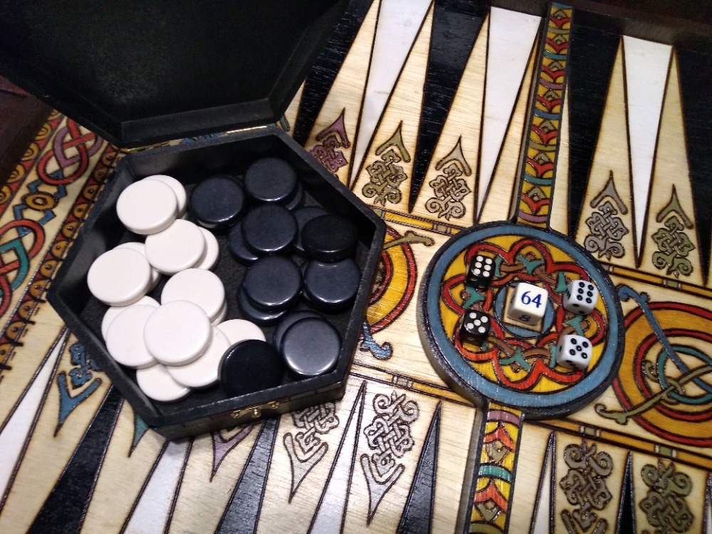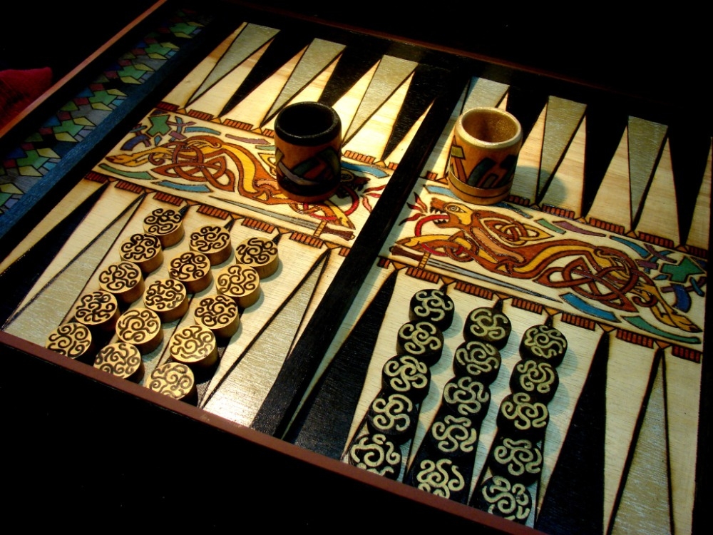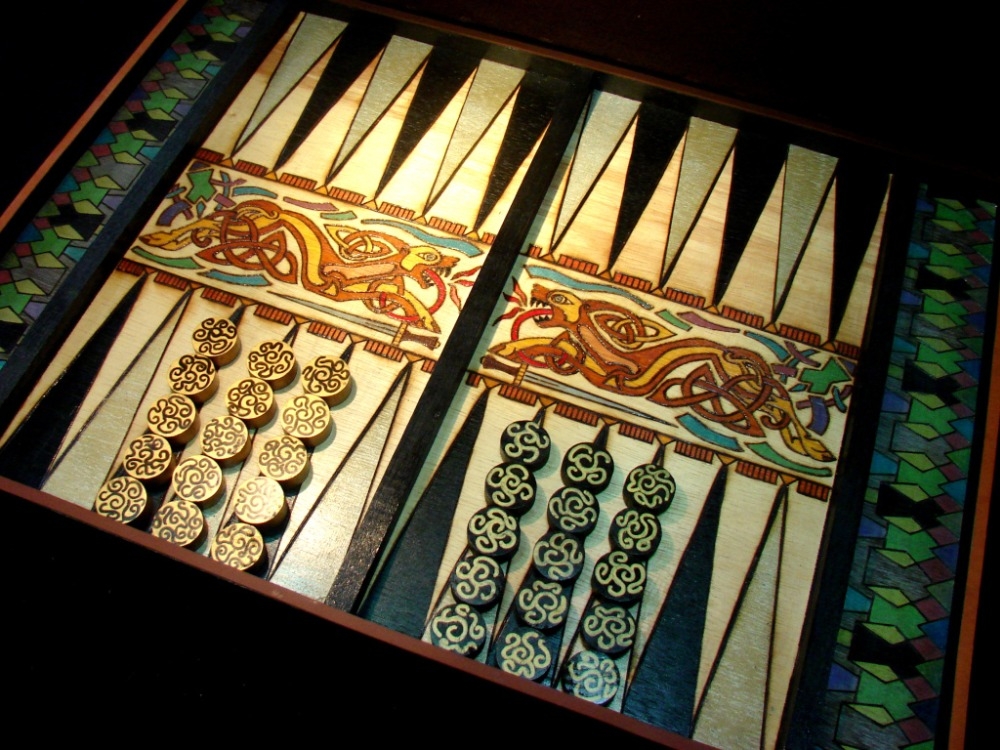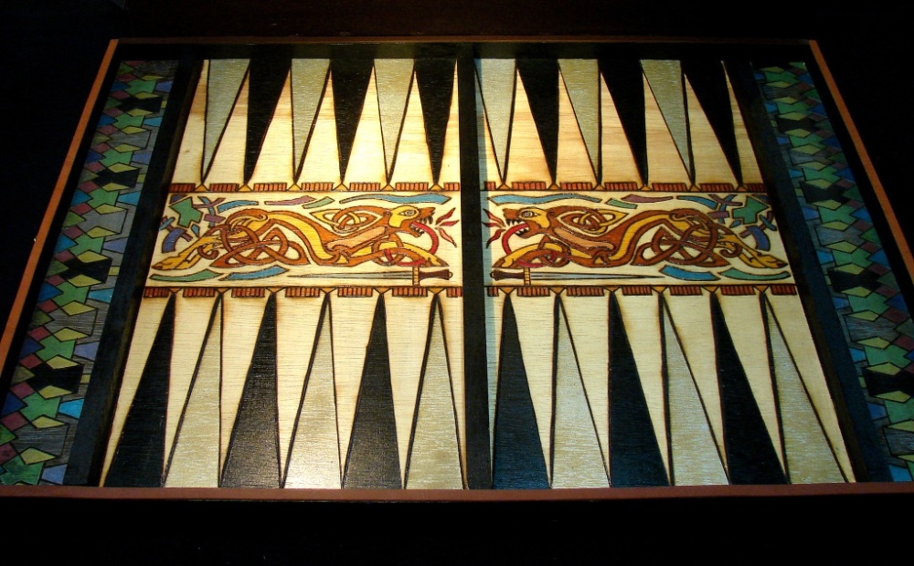 Gamão Celta, criado em técnica de Pirogravura em madeira com pintura em técnica mista. Artista Paulo Netto do Arte em Fogo. Backgammon