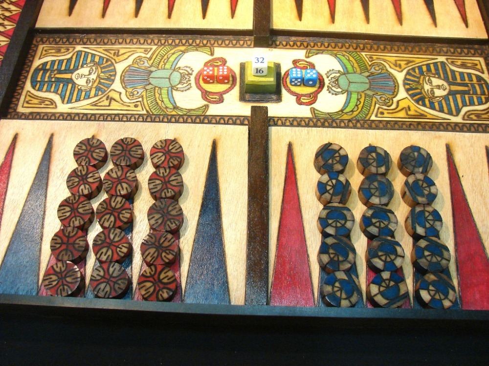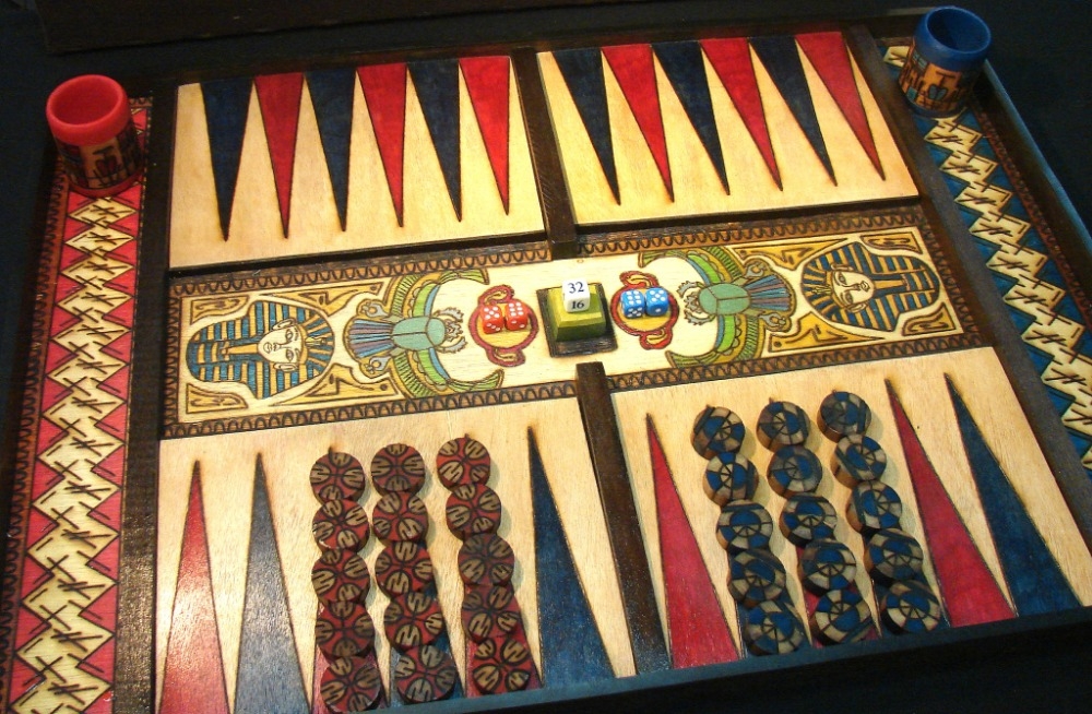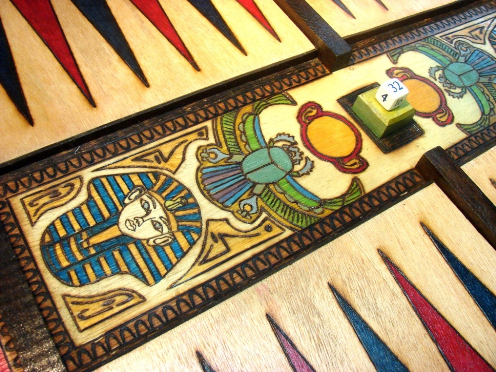Tabuleiro criado em técnica de Pirogravura em madeira com pintura em técnica mista pelo ateliê Arte em Fogo, artista Paulo Netto Backgammon