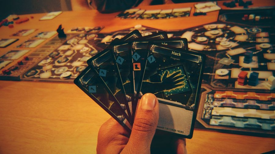 Planejando o que fazer comas ferramentas que aparecem na mão Clank! In! Space!: A Deck-Building Adventure