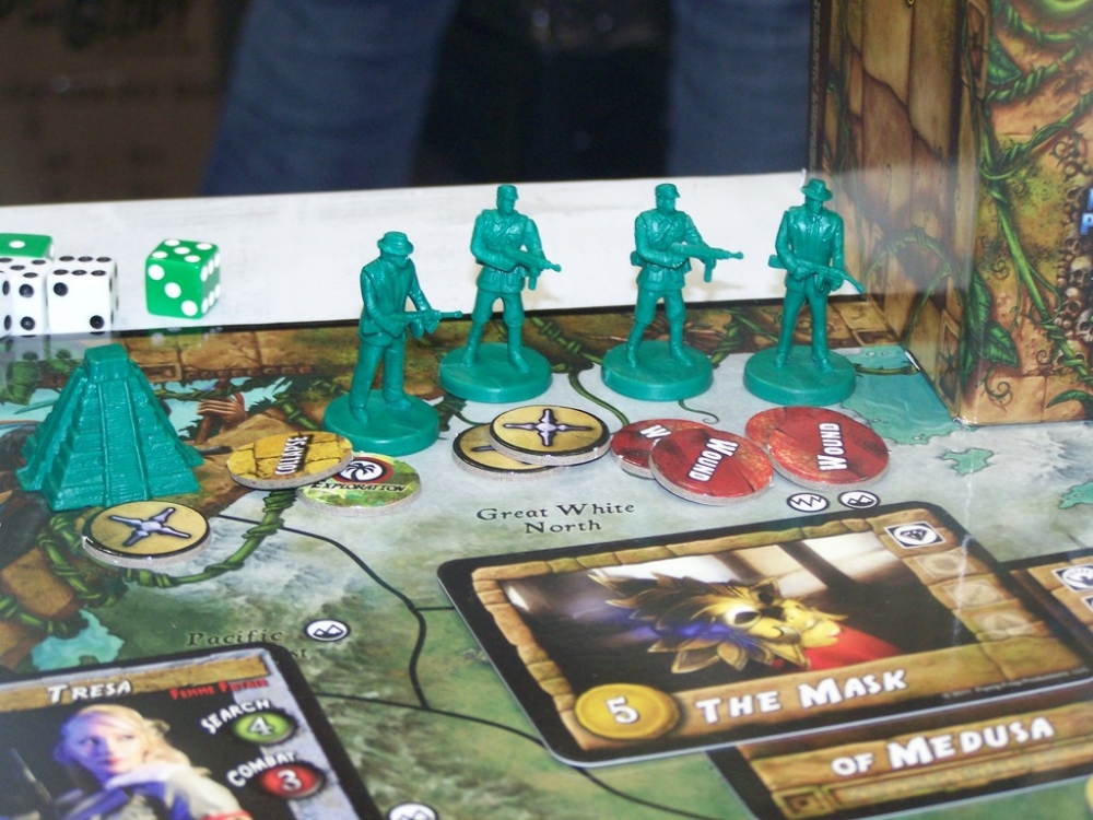 Nazistas espalham o terror do 3º Reich pelo mundo. Ao centro, TREZA pronta para tentar encontrar um Artefato. À direita, LI MEI CHEN (vermelha) e JENNY BUTTLER (azul) atacam uma BASE SECRETA NAZISTA em HONK KONG tentando recuper artefatos dos vilões. Fortune and Glory: The Cliffhanger Game