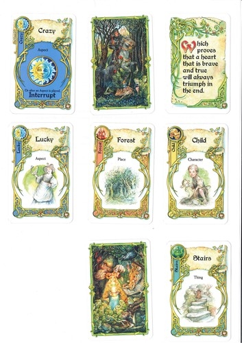 2ª edição: cartas de Final Feliz, Interrupção e exemplo de cada categoria de carta, frente e verso. Once Upon a Time: The Storytelling Card Game