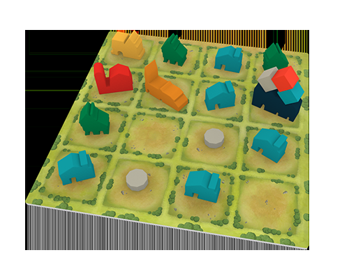 Caixinhas e suportes de cartas para organizar o jogo. Tiny Towns