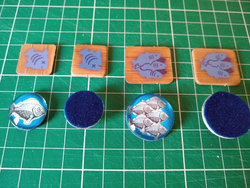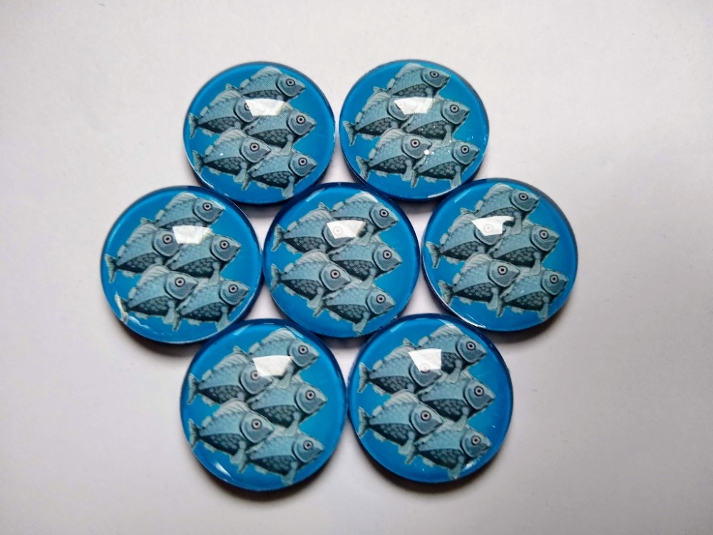Tokens de cinco peixes com cabochão de vidro de 25mm de diâmetro. The Isle of Cats