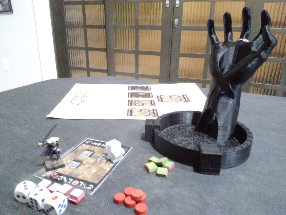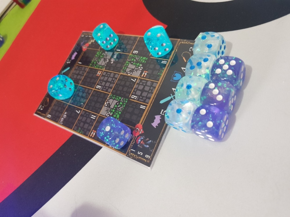 Jogo em andamento. Começo do terceiro level, ultilizando meeples e miniatura como personagens e tokens para marcar a vida e habilidade do herói e vida dos monstros. Três dados para o nível de energia do herói a cada turno. * One Card Dungeon
