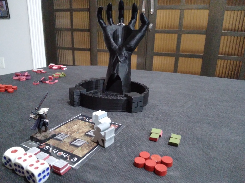 Jogo em andamento. Começo de jogo, ultilizando meeples e miniatura como personagens e tokens para marcar a vida e habilidade do herói e vida dos monstros. Três dados para o nível de energia do herói a cada turno. * One Card Dungeon