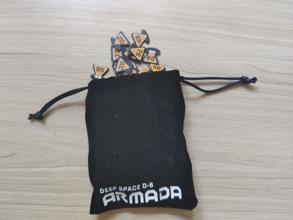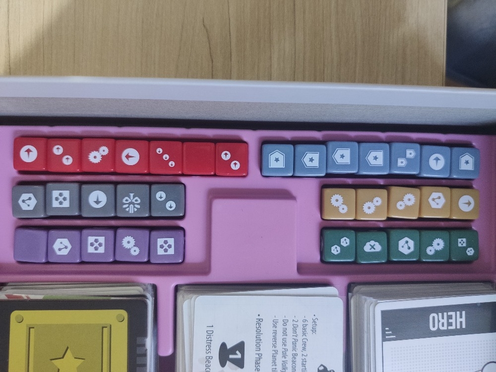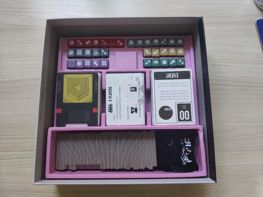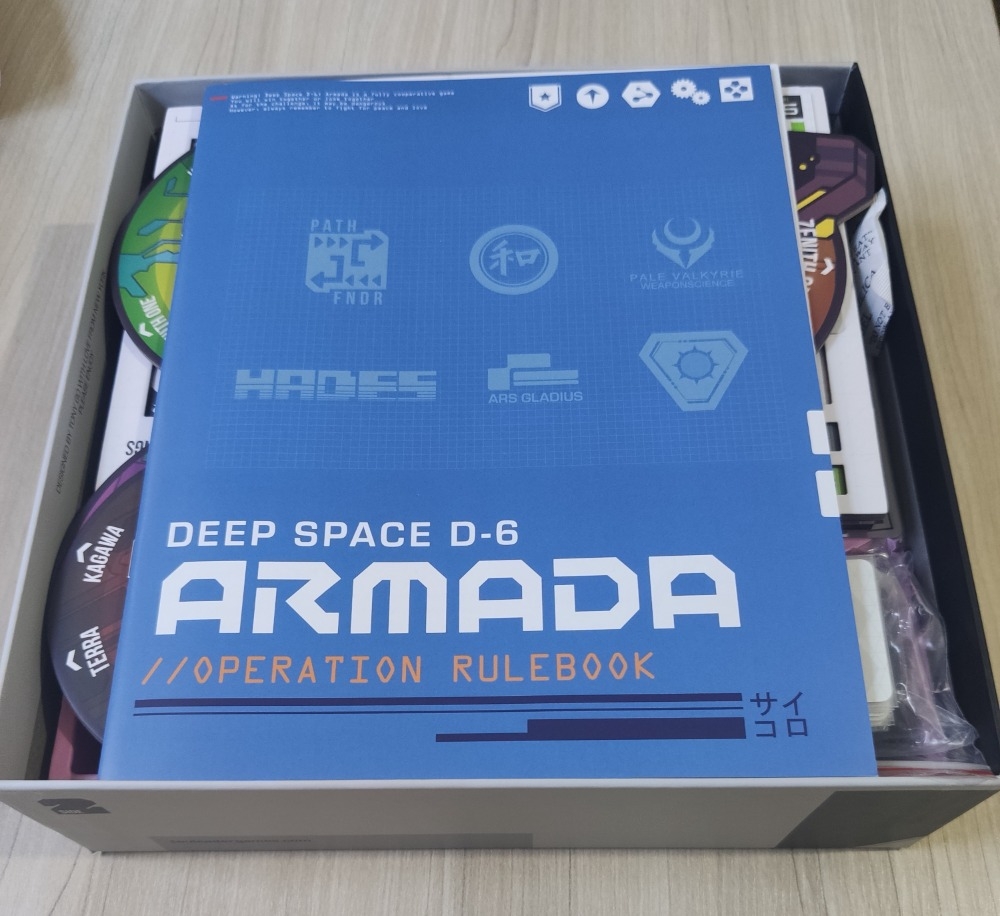 Organizador que acompanha o jogo. Não há espaço no para todos os componentes no organizador, sendo necessário usar Ziplocks. Deep Space D-6: Armada