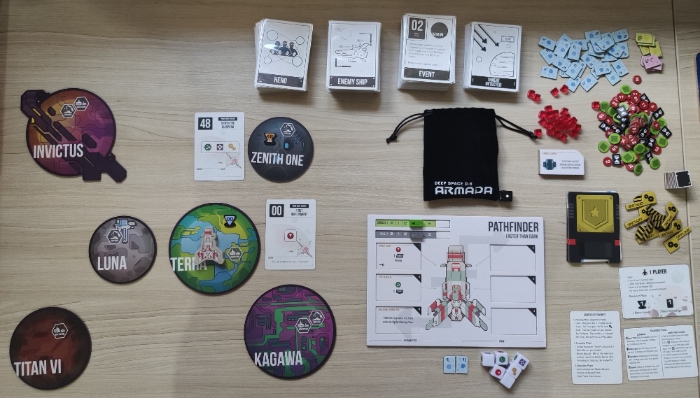 Nave, cartas de resumo e marcadores dispostos na mesa para modo solo. Deep Space D-6: Armada