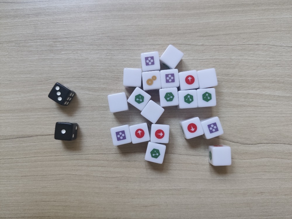 Dados de tripulação, brancos, e dados de inimigo, pretos. Deep Space D-6: Armada