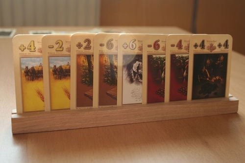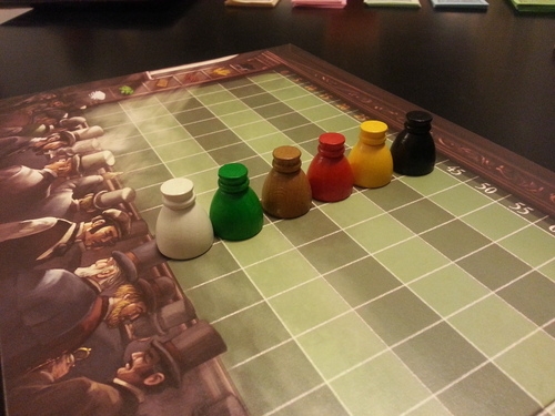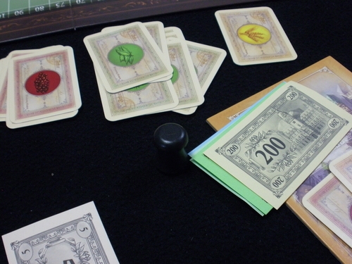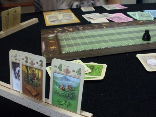 Visão do jogador: em primeiro plano cartas de influência disponíveis; em segundo plano a trilha da bolsa de valores. Hab & Gut