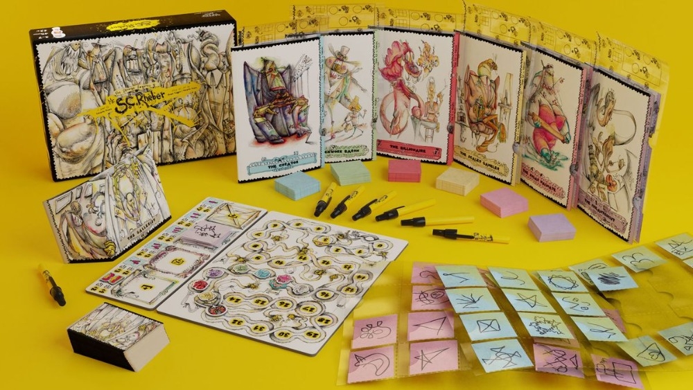 Alguns componentes do jogo The Strange Forgeries Of Mr. S.C.Rheber