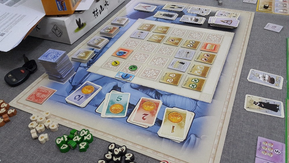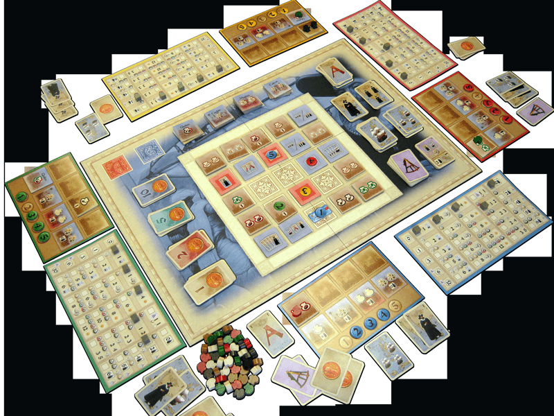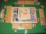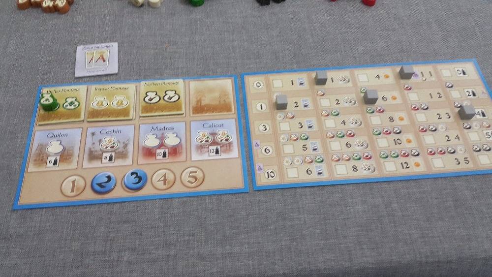 Tabuleiros individuais, e parte do tabuleiro principal. Final de partida. Vitória da cor amarelo por 41pts. Goa: A New Expedition