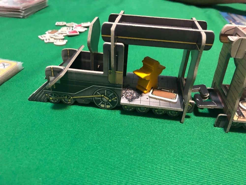 Partida de Colt Express, mesmo na penumbra, durante o 37°Boardgames São Paulo (29/06/2018). Presentes: conde_dl, jessicahelena, Jaque Hanna, bcda e danilochiaretto. Colt Express
