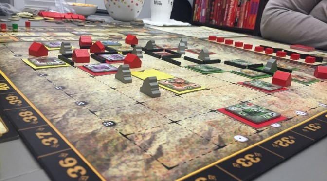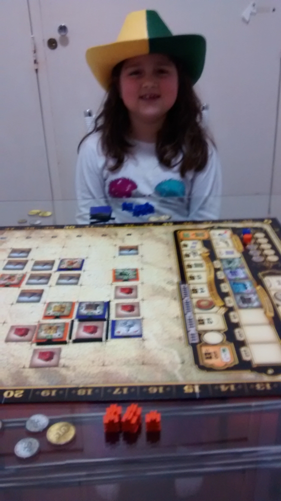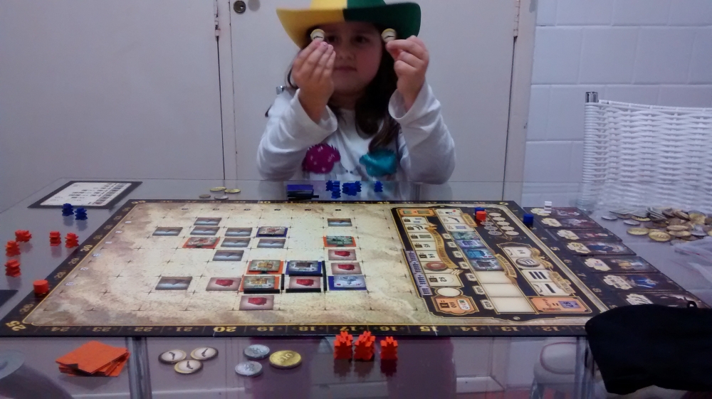 Jogatina com minha parcerinha! Ela ainda não aguenta uma partida inteira, mas curtiu a mecânica, e os meeples cowboys!! Carson City