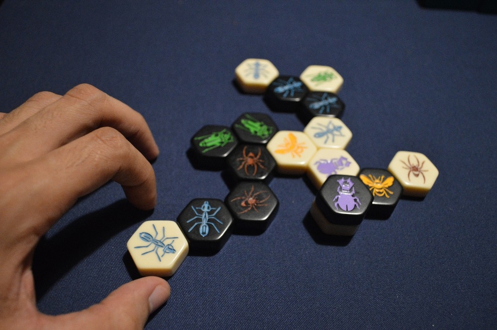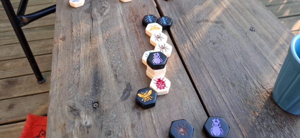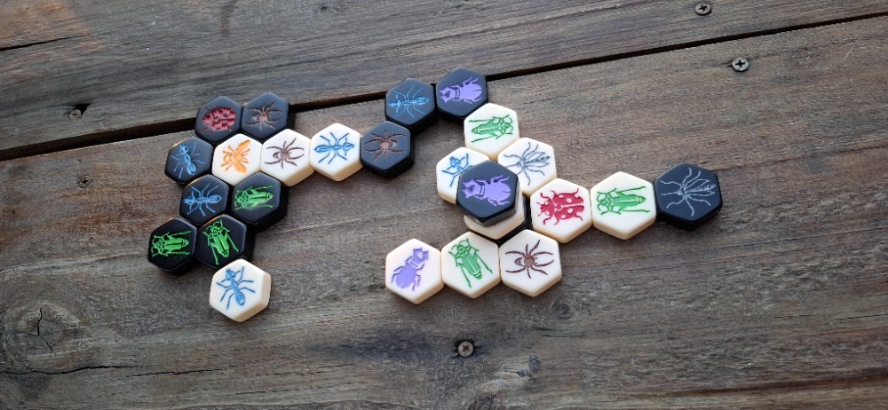 Hive Pocket sem uso de expansões. Situação de empate. As duas abelhas rainhas foram cercadas no mesmo turno. Hive Pocket
