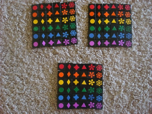 Peças com todos formatos e cores. Qwirkle