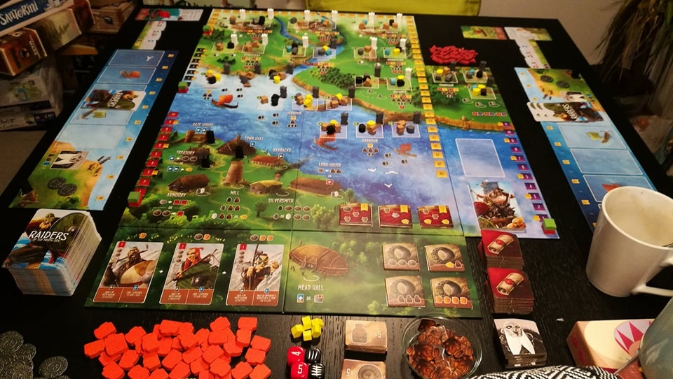 Setup pronto para uma partida usando as duas expansões (Fields of Fame e Hall of Heroes) Raiders of the North Sea