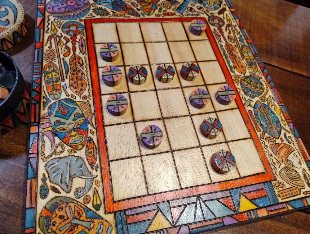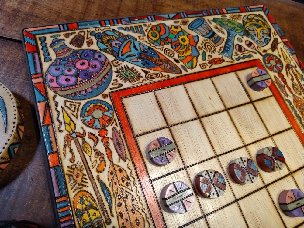Tabuleiro criado pelo ateliê ARTE em FOGO. Técnica de pirogravura em madeira com pintura em técnica mista. Yoté