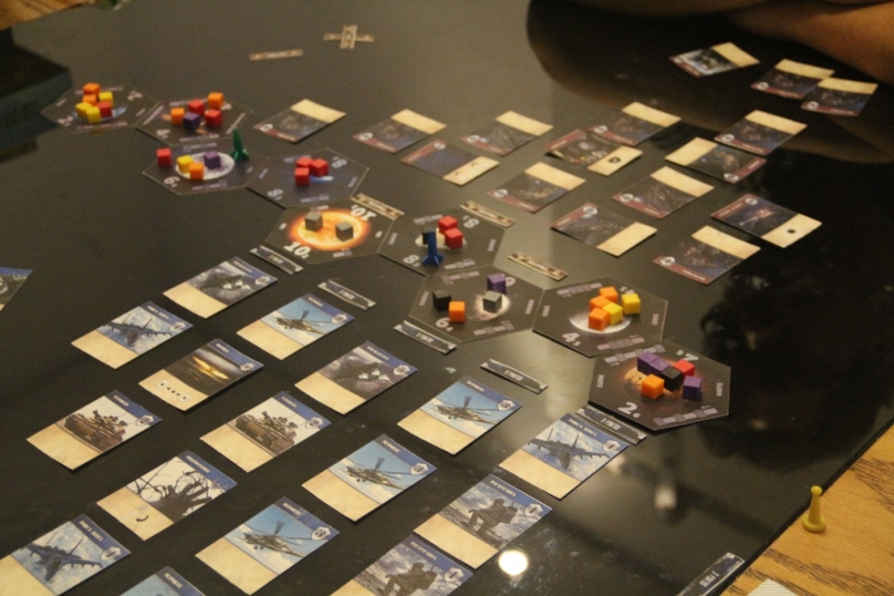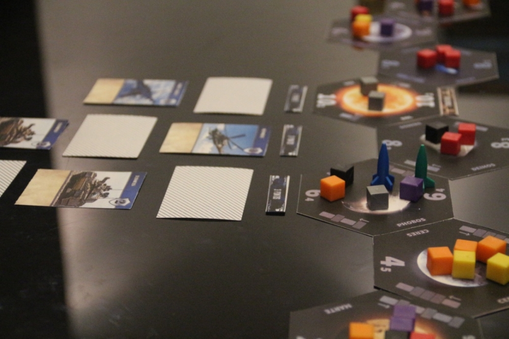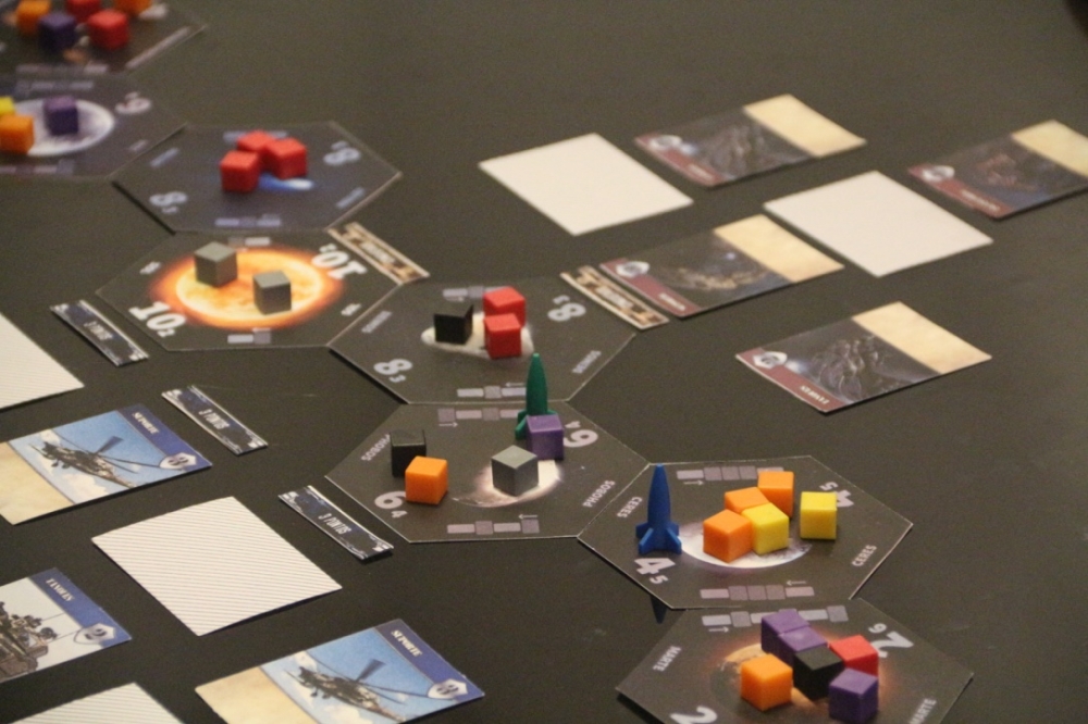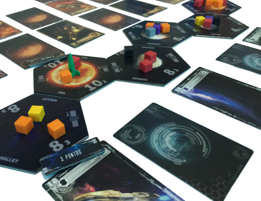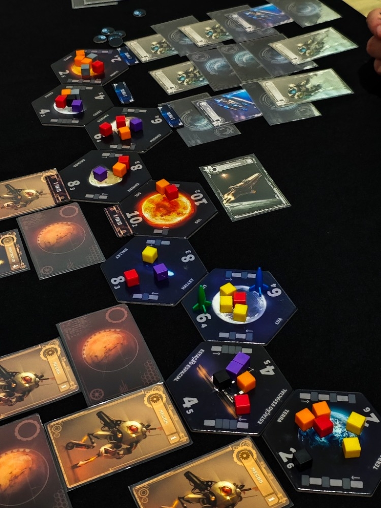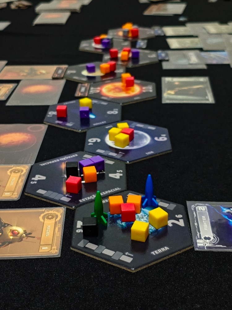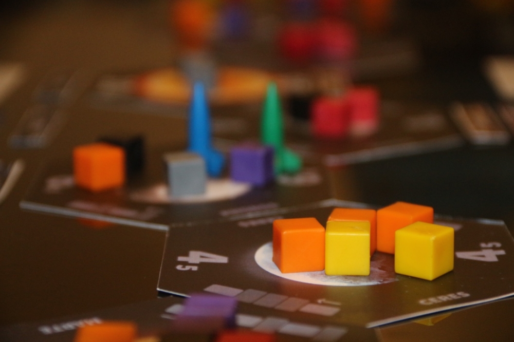 Partida com protótipo - A lua Ceres com tecnologias e relíquias laranjas e amarelas. No final da partida contam-se pontos para conjuntos de cores diferentes. Supernova: Um Novo Êxodo