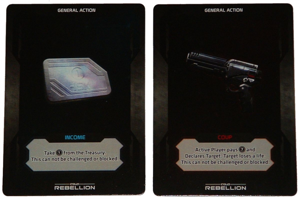 Cartas de Ações Gerais: Income (coletar 1 moeda, não pode ser bloqueado) e Coup (gastar 7 para o adversário perder 1 influência, não pode ser bloqueado) Coup: Rebellion G54