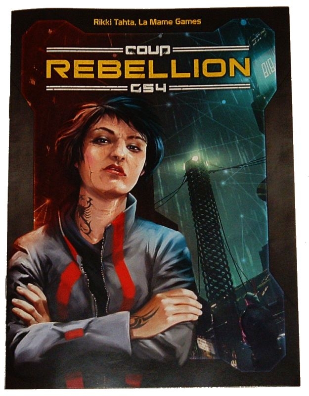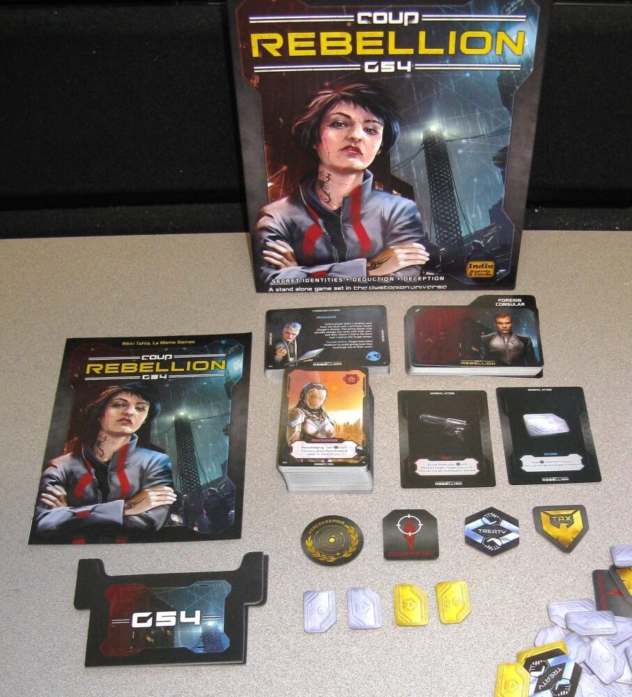 Caixa de Coup: Rebellion G54 contendo o jogo e também Coup, Coup: Reformation, e One Night Rebellion Coup: Rebellion G54