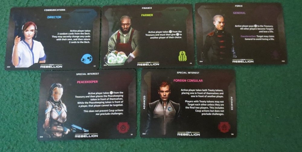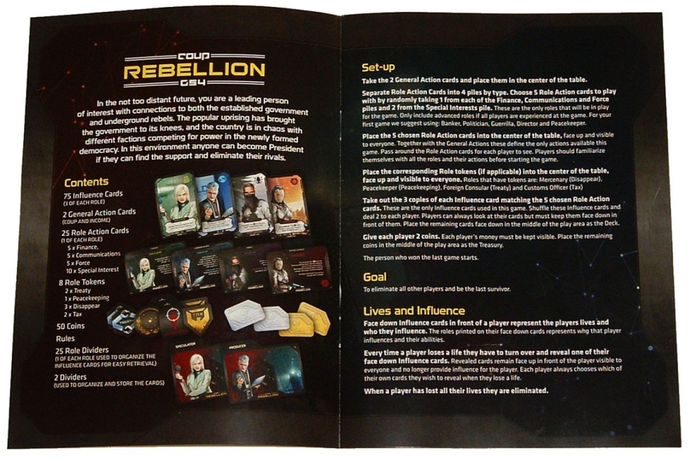Setup: Separar os papeis em 4 pilhas por tipo, escolher aleatoriamente 2 cartas da pilha de interesses especiais e 1 das demais pilhas. Separar 3 influências de cada papel sorteado, misturar e distribuir 2 para cada jogador e 2 moedas de valor 1. Coup: Rebellion G54