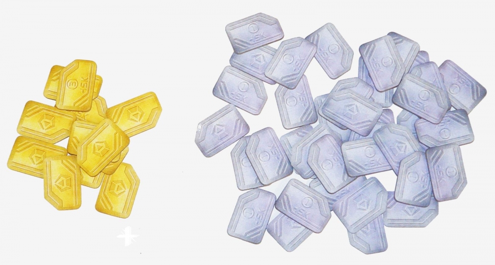 Todas as moedas do jogo: Dourada com valor 3, e Prateadas com valor 1 Coup: Rebellion G54