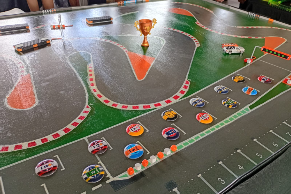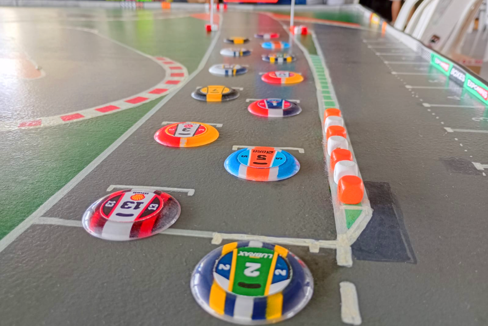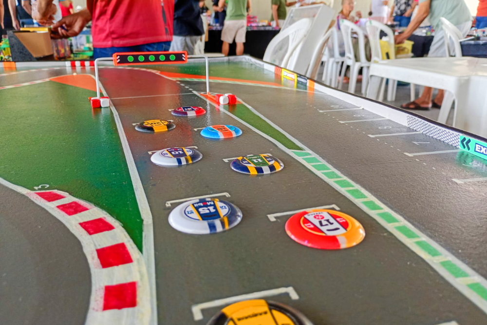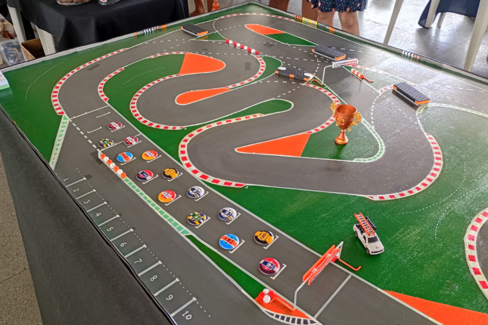 Grid de largada de prova de automobilismo de mesa com mesa autódromo em evento da modalidade. Corrida de Botão