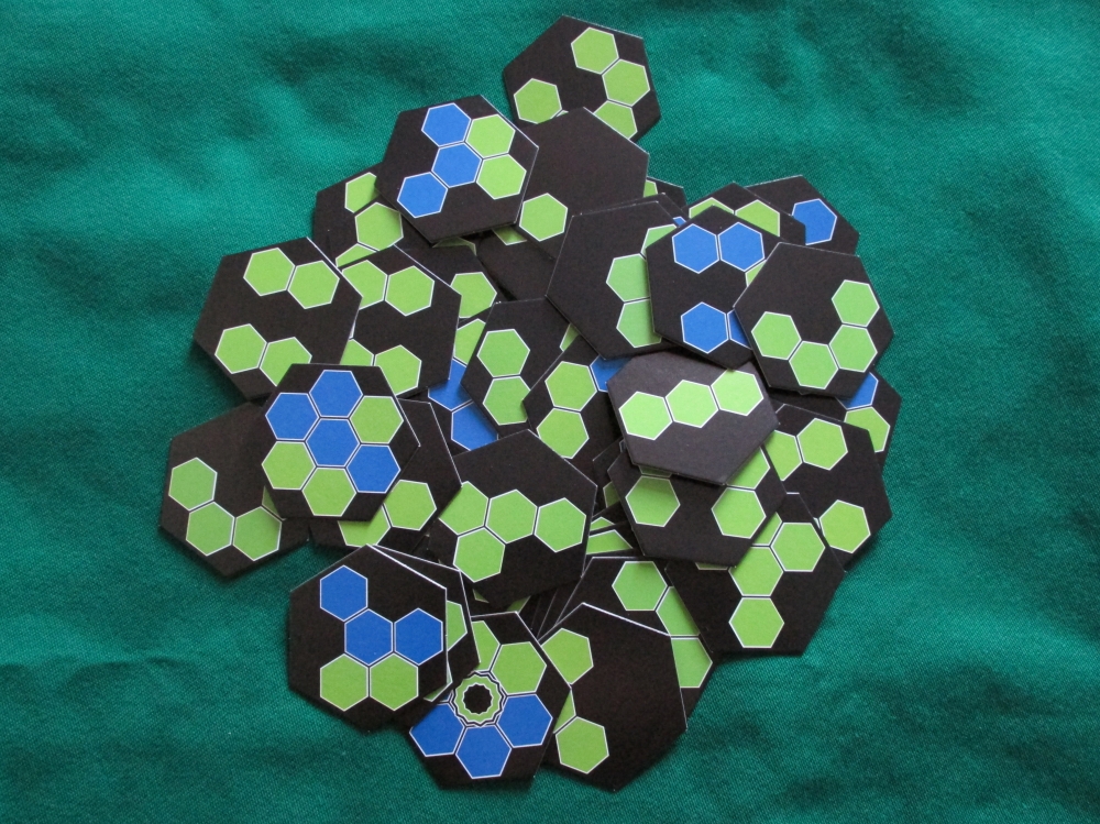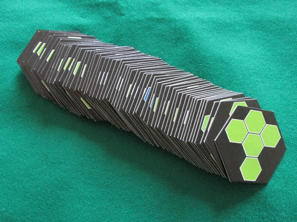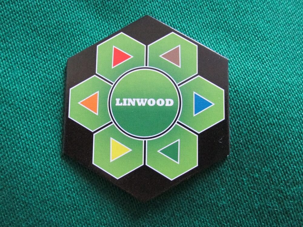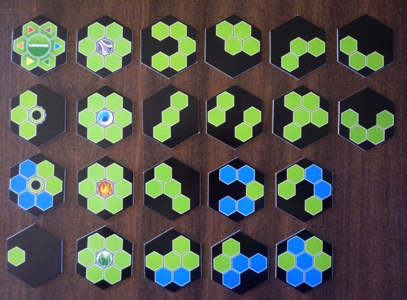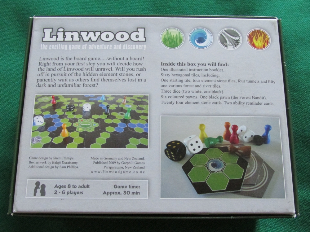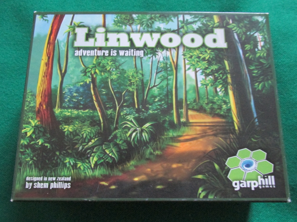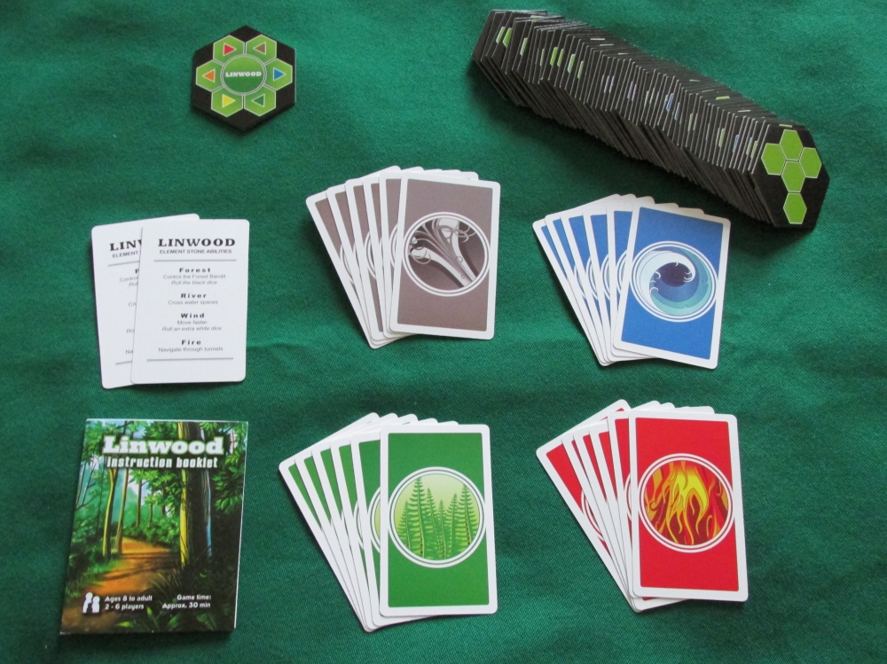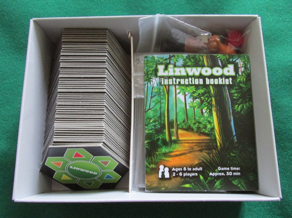 Visão geral de quase todos os componentes. Faltaram os dados e peões de jogadores. Linwood