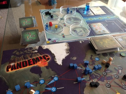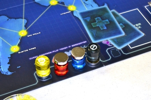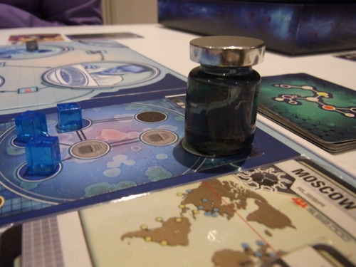 Doenças azul e vermelha sendo pesquisadas para encontrar a cura. A Vermelha só precisava de mais uma amostra das doenças preta e vermelha, mas o resultado fatídico nos alcançou primeiro. Doenças amarela e preta já curadas. Partida em dois jogadores. Pandemic: In the Lab