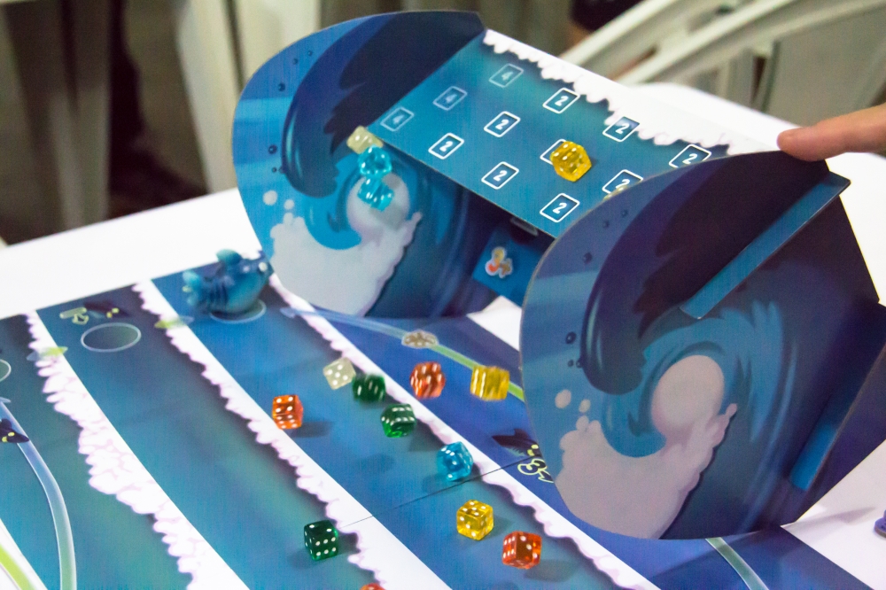 Um dos tiles de "missão", nesse caso para voar alto, com os cubos disponíveis (sorteados). Balloon Cup