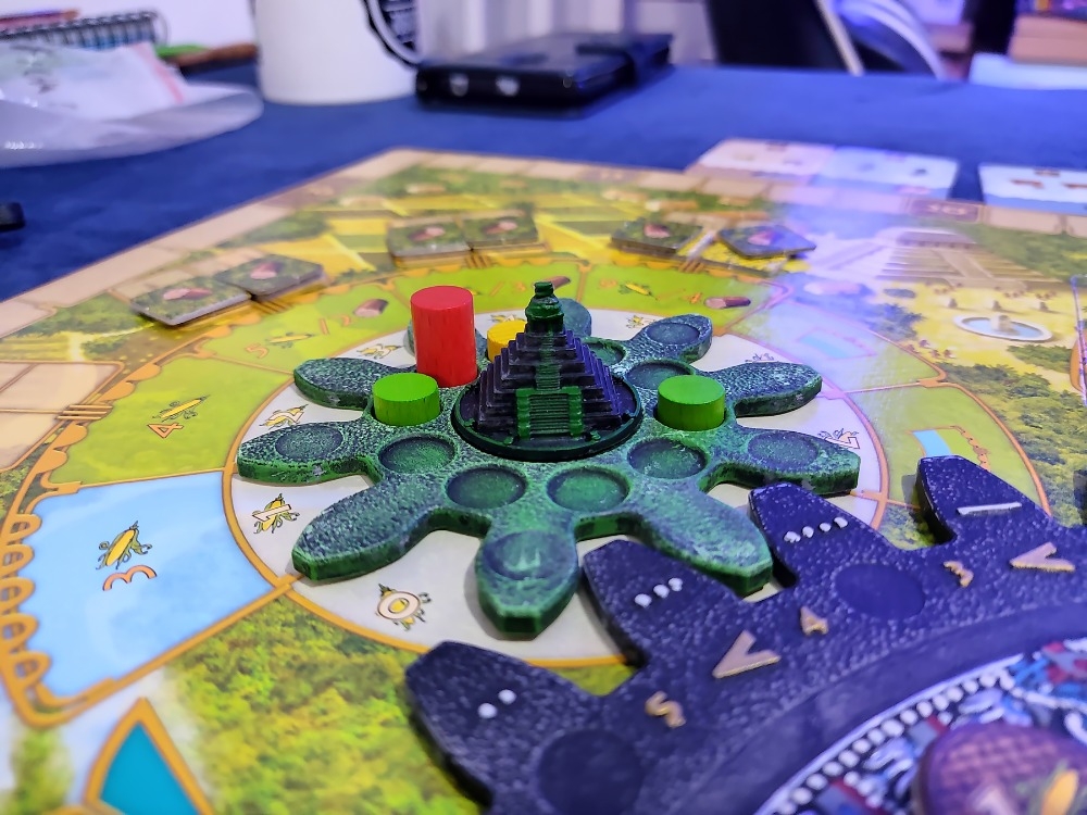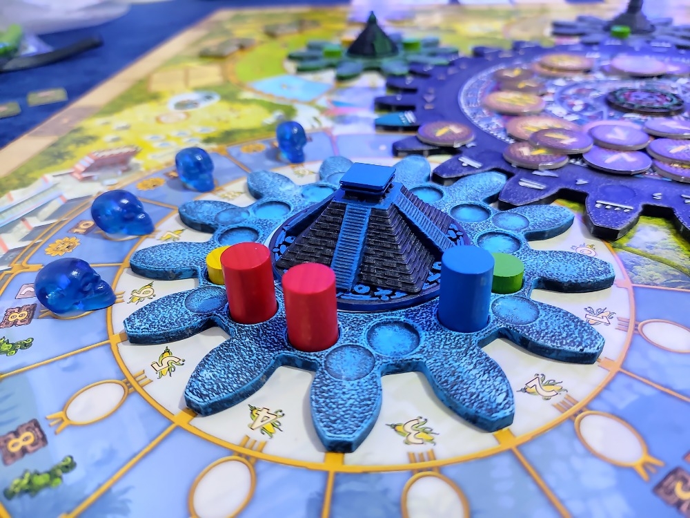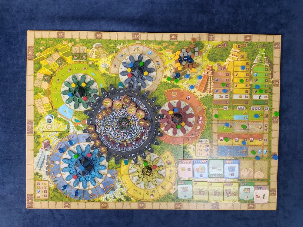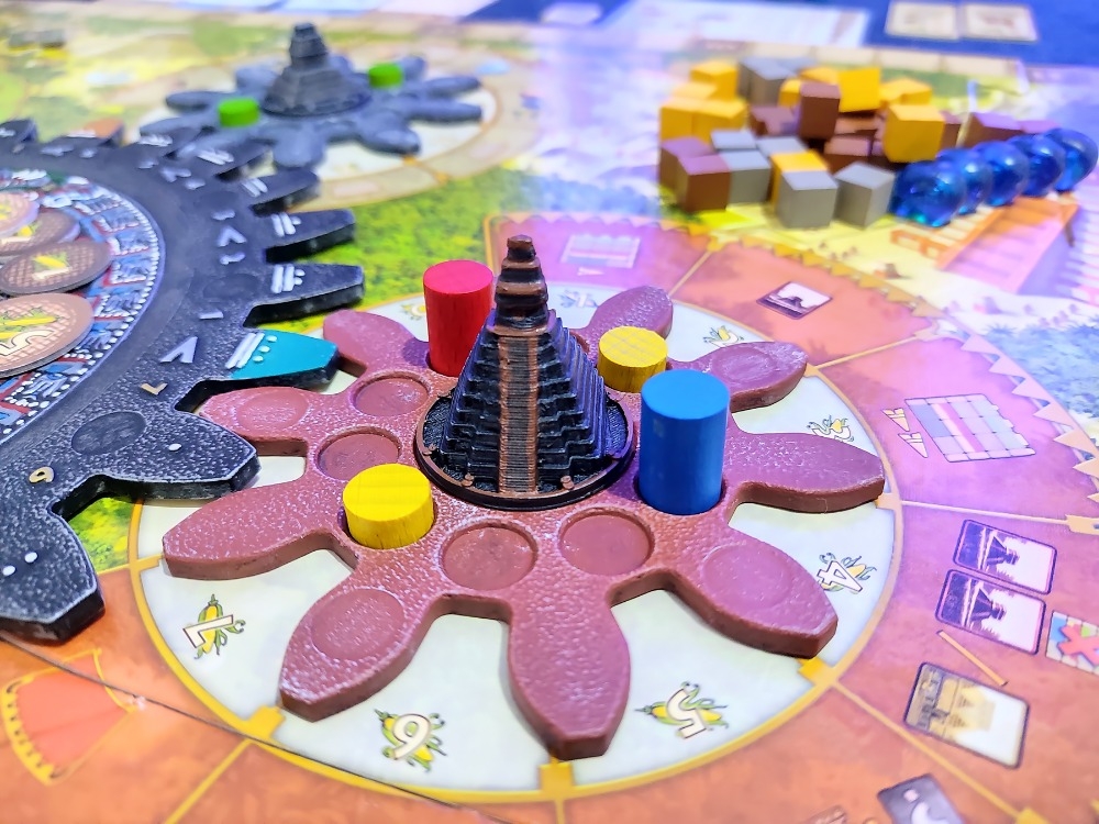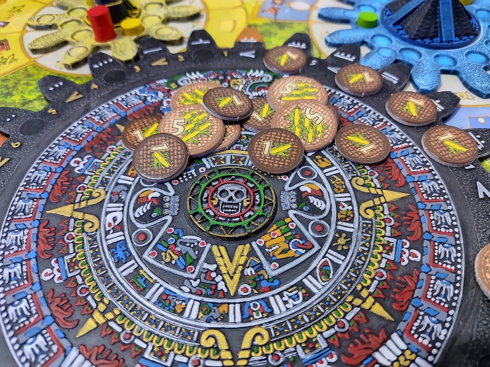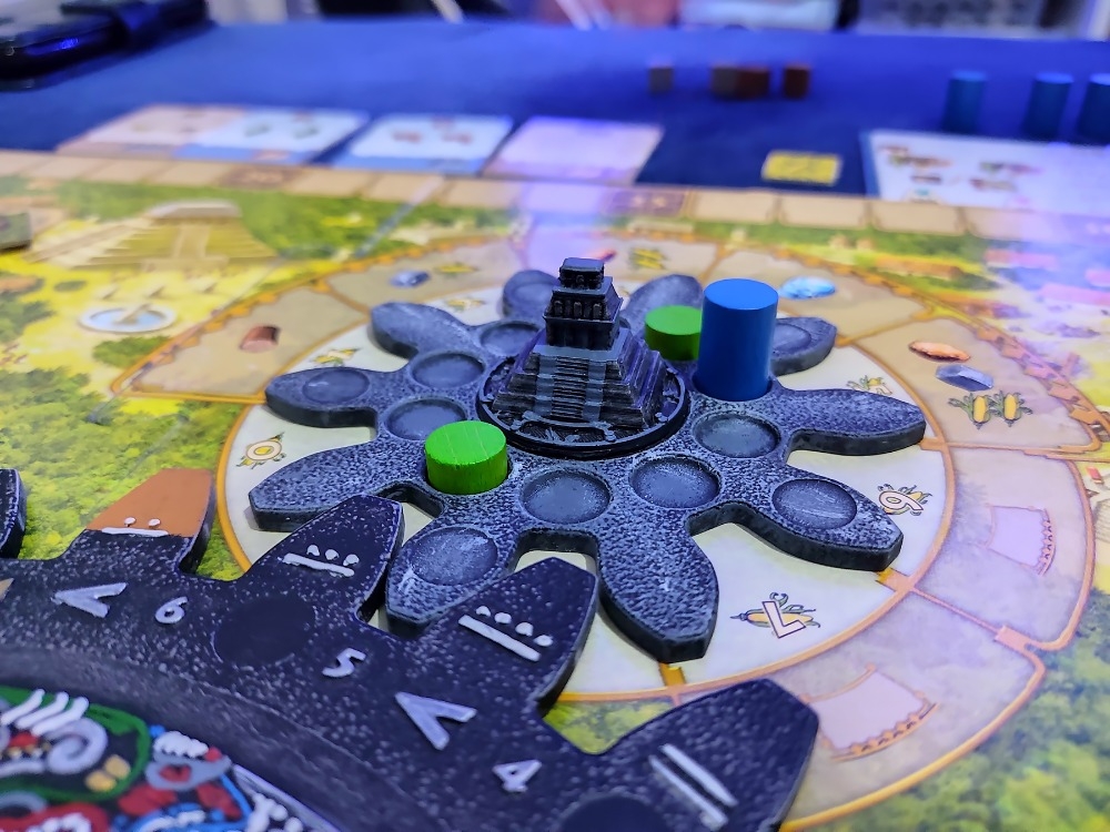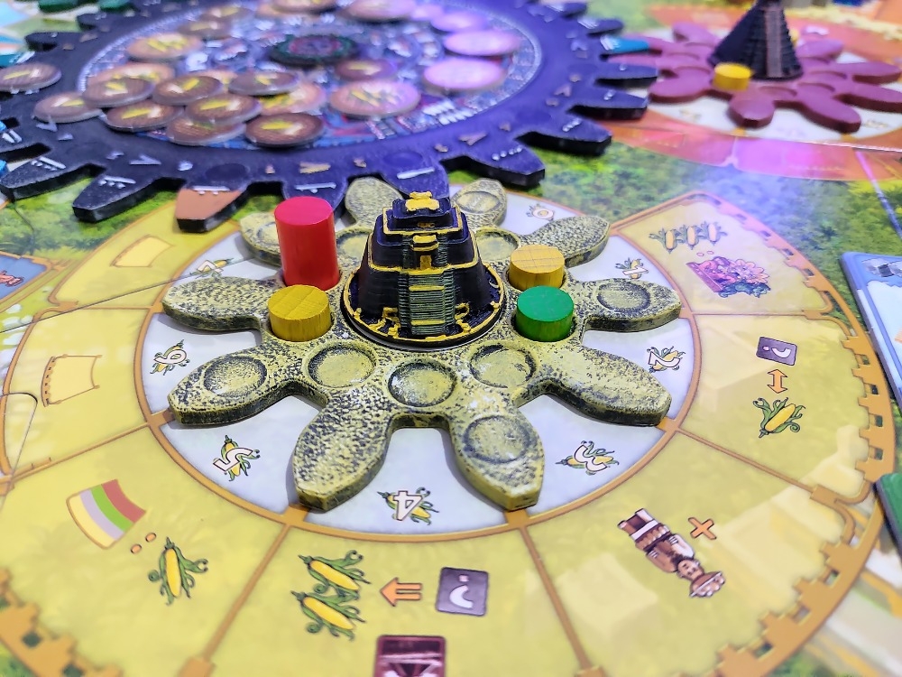 Tzolk'in com a peça central e engrenagem pintadas Tzolk'in: The Mayan Calendar