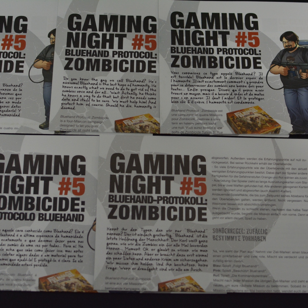Manual e campanha em diferentes idiomas Zombicide: Gaming Night #5 – Bluehand Protocol