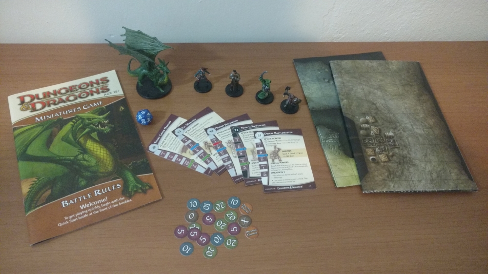 Starter Set com 5 miniaturas e seus cartões de habilidades, manual, dois mapas de dupla-face, um dado d20 e tokens. Dungeons & Dragons Miniatures Game (second edition)