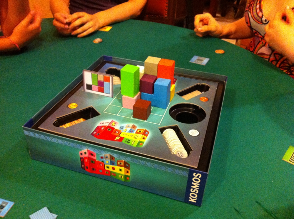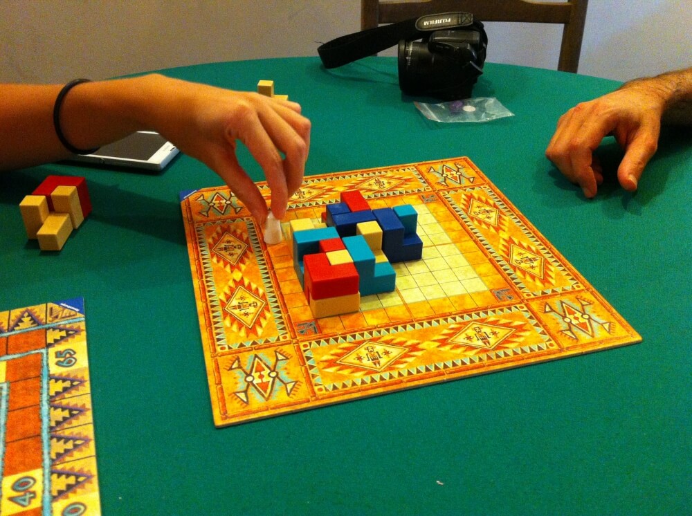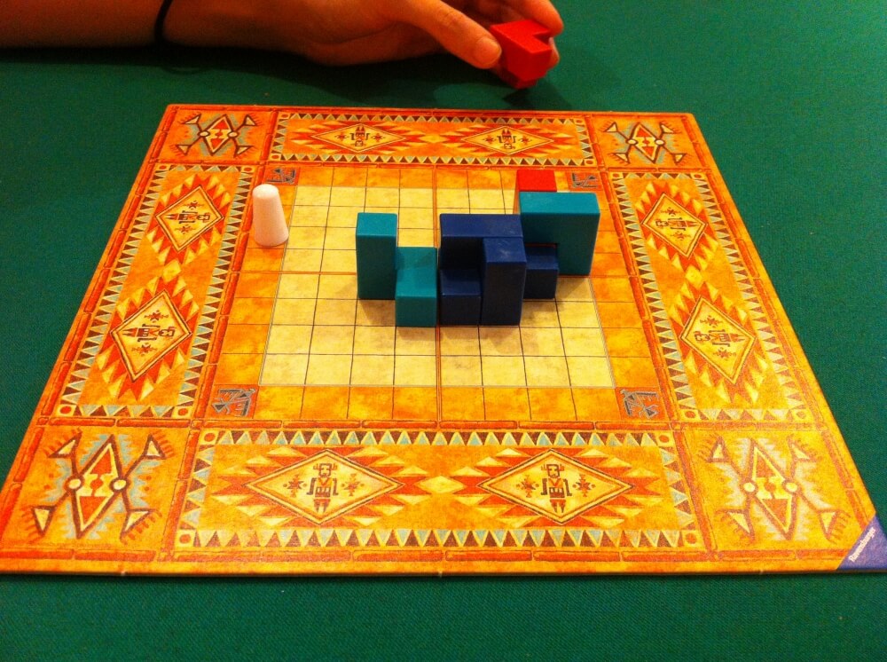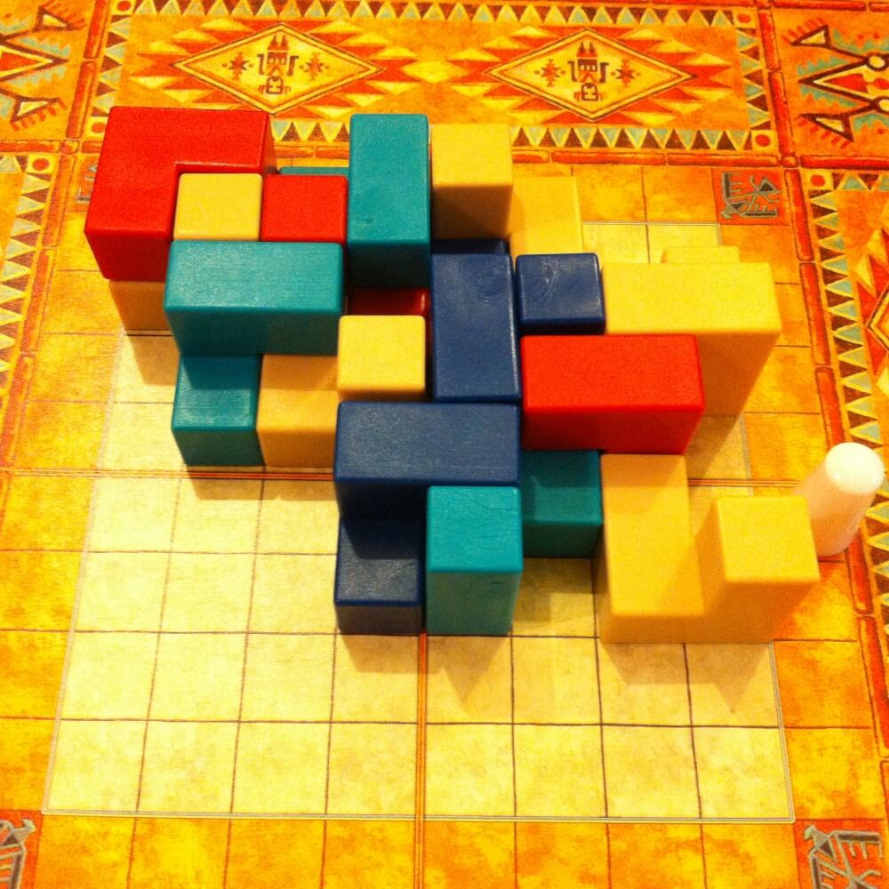 Pueblo é um jogo abstrato onde vc tem que usar dois tipos de peças, uma com a sua cor e outra com uma cor comum a todos os jogadores. O objetivo é usar as peças comuns para esconder as duas peças coloridas para que o fiscal (pino branco) não veja. Pueblo