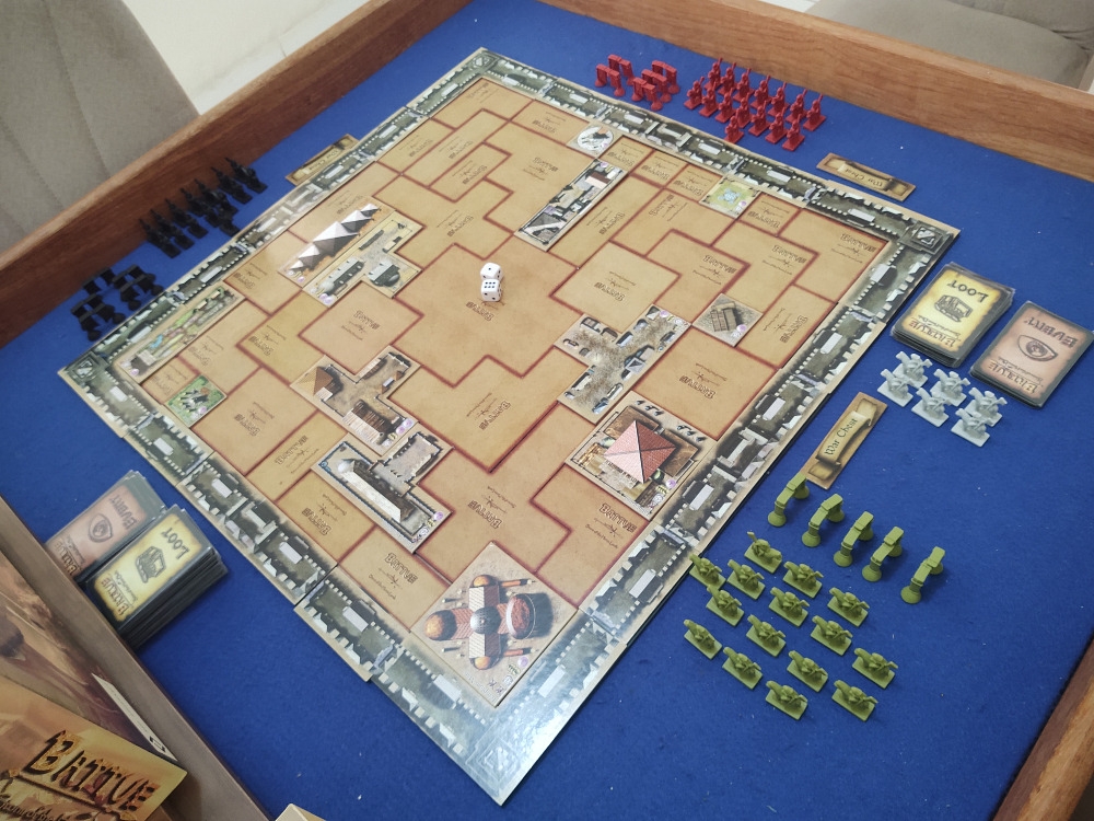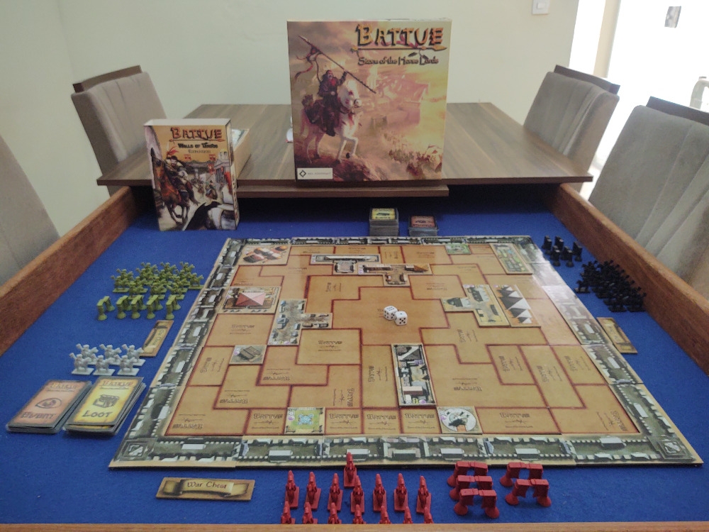 Setup pronto com os componentes da expansão no tabuleiro virados para cima. Cartas e exército branco da expansão no canto inferior esquerdo. Battue: The Walls of Tarsos