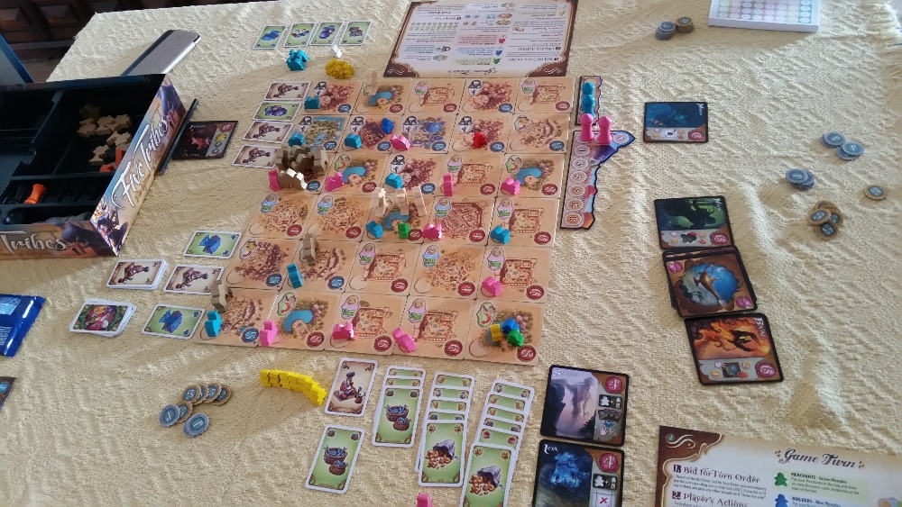 Fim do primeiro jogo - O tabuleiro fica meio triste vazio assim. Five Tribes: The Djinns of Naqala