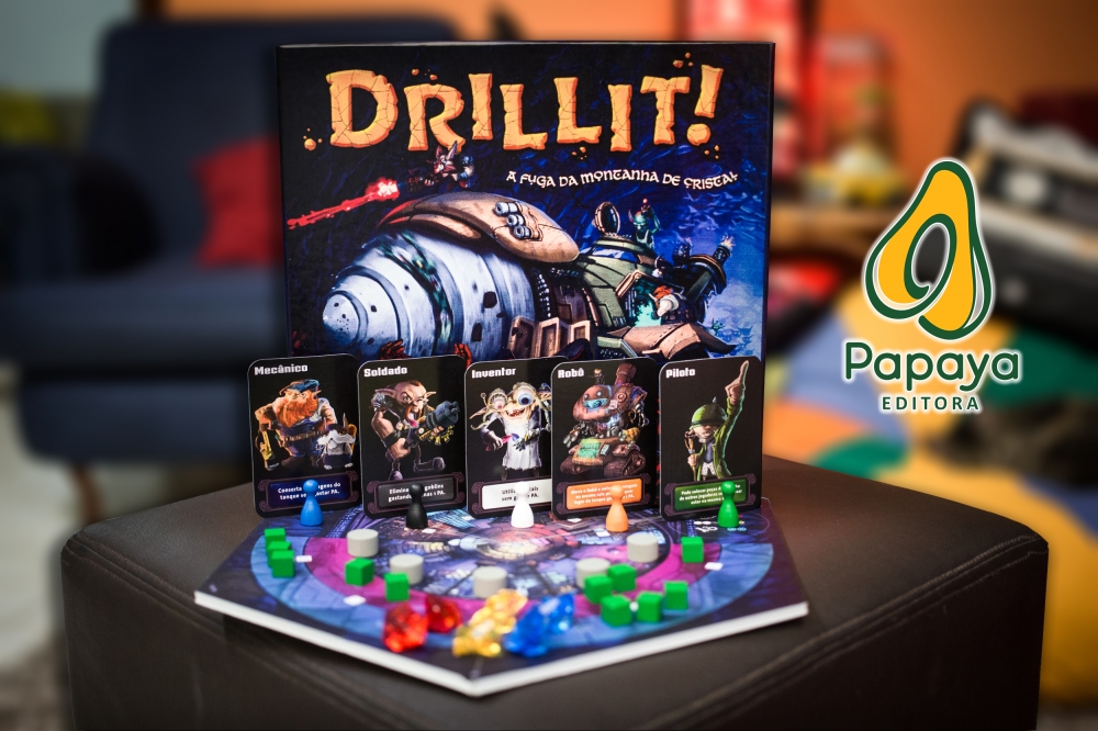 Protótipo da versão da Papaya Editora. Componentes ainda indefinidos. Drillit! A Fuga da Montanha de Cristal