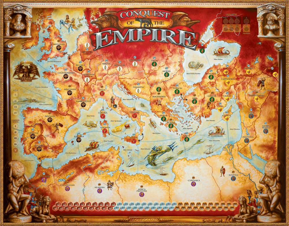 Tabuleiro expandido com 48 províncias e dividido em 7 regiões. Para ser usado com as regras variantes COTE generais. Um arquivo com melhor qualidade pode ser encontrado aqui: https://www.ludopedia.com.br/jogo/conquest-of-the-empire/anexos/99484 Conquest of the Empire