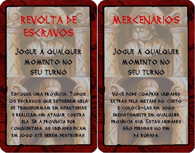 Amostra de cartas de províncias para serem usadas com as regras variantes COTE Generais. O arquivo print and play pode ser encontrado aqui: https://www.ludopedia.com.br/jogo/conquest-of-the-empire/anexos/99489 Conquest of the Empire