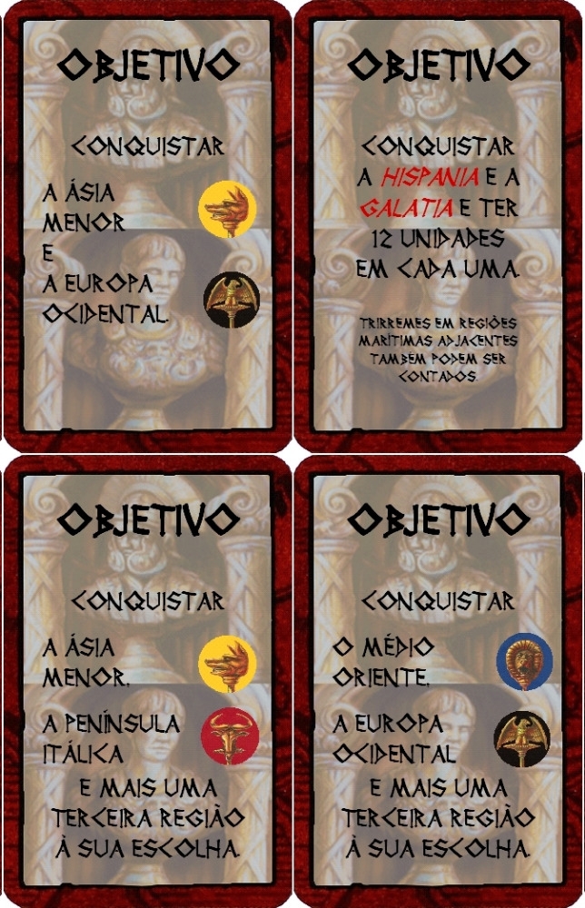 Amostra de cartas de objetivos para serem usadas com as regras variantes COTE Generais. O arquivo print and play pode ser encontrado aqui: https://www.ludopedia.com.br/jogo/conquest-of-the-empire/anexos/99488 Conquest of the Empire