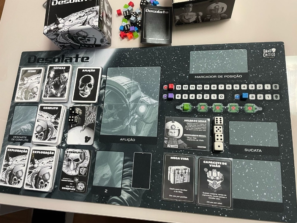 Demonstração do playmat com os componentes do jogo Desolate