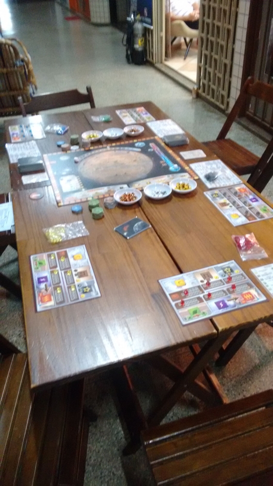 Setup para 5 jogadores. Moebius Café, Brasília, 08/11/16. Terraforming Mars