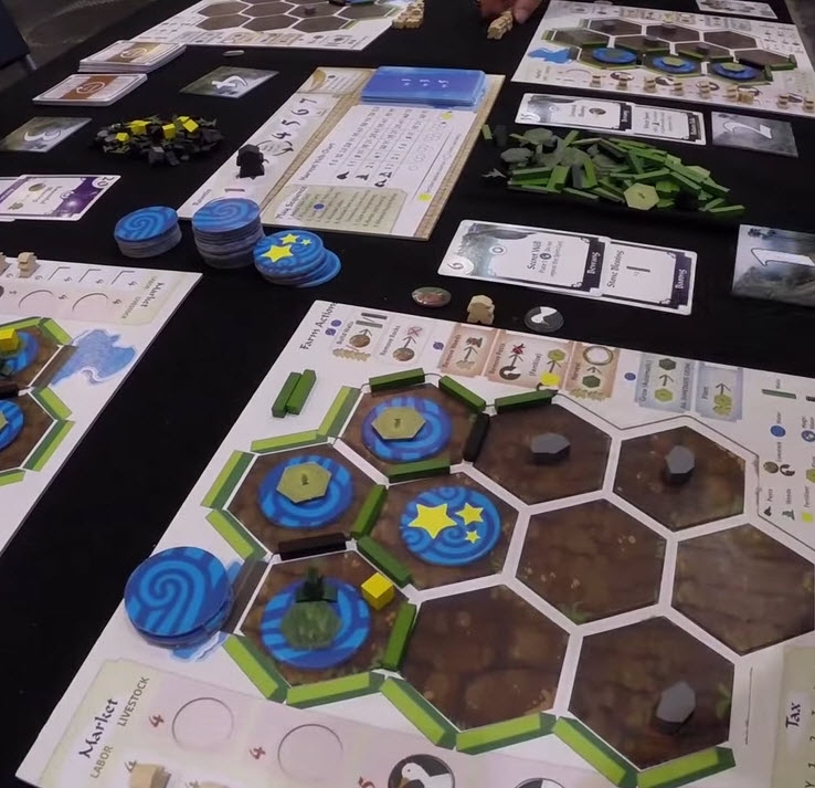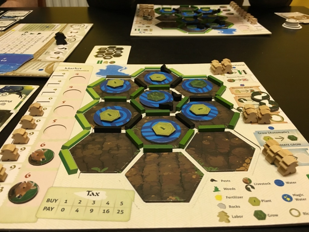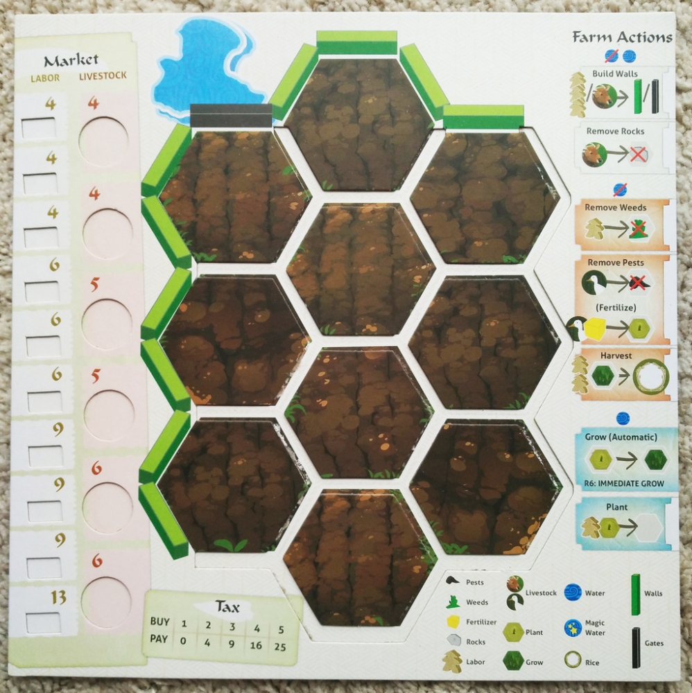 Detalhe do tabuleiro do jogador durante a partida. Spirits of the Rice Paddy