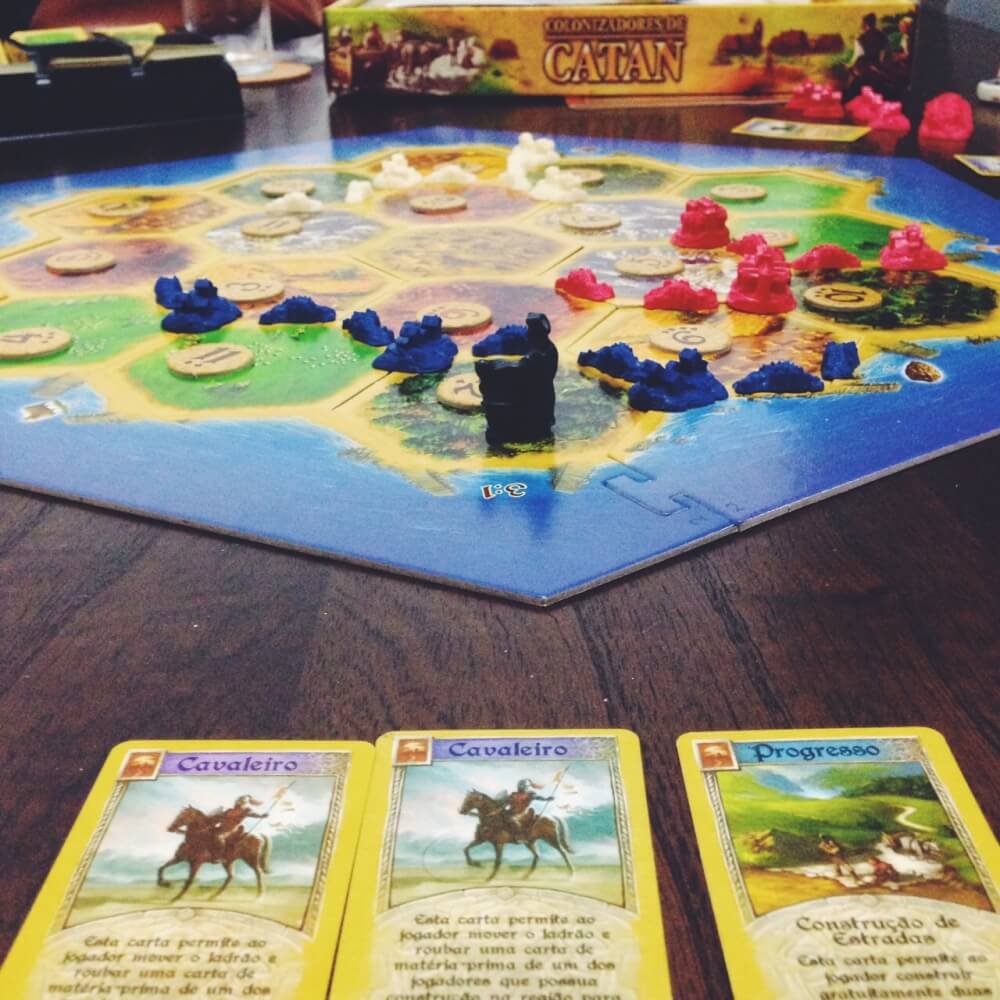 Jogo em andamento, com detalhe para as cartas de Desenvolvimento CATAN (The Settlers of Catan)