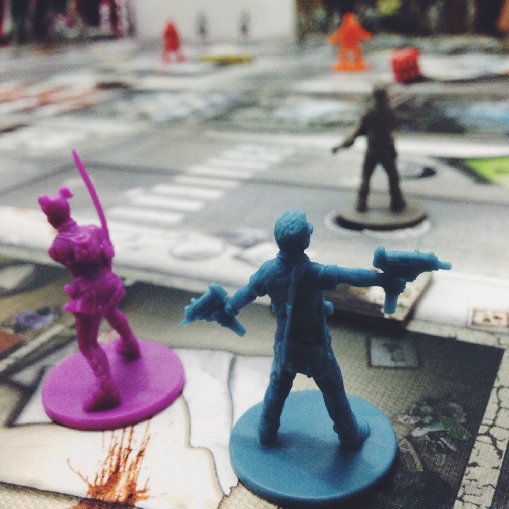Detalhes das miniaturas dos personagens jogadores no tabuleiro Zombicide