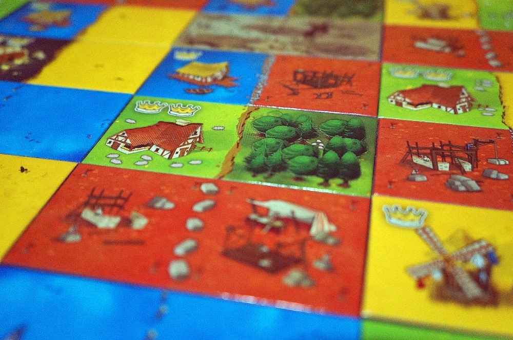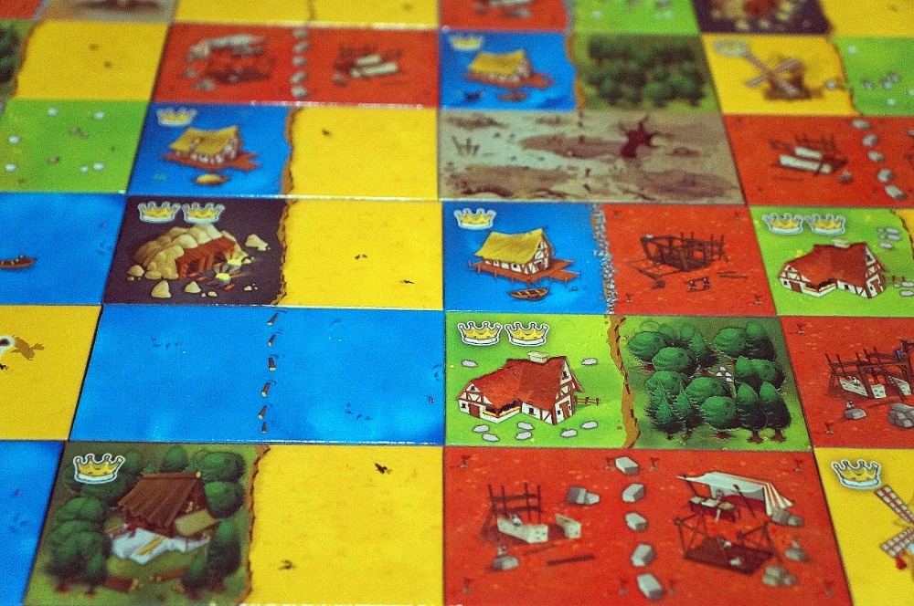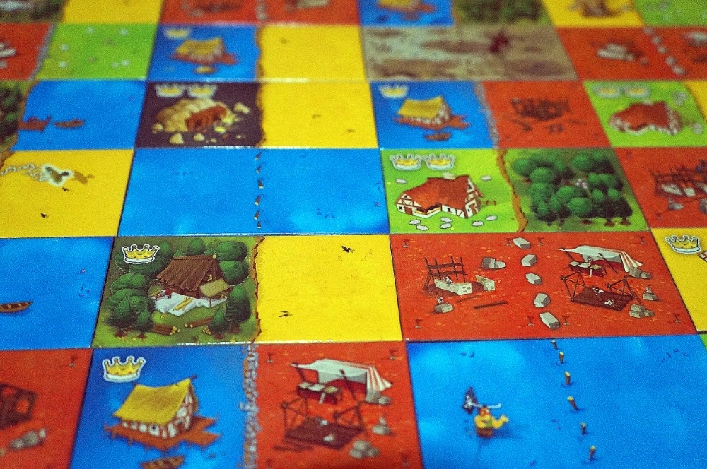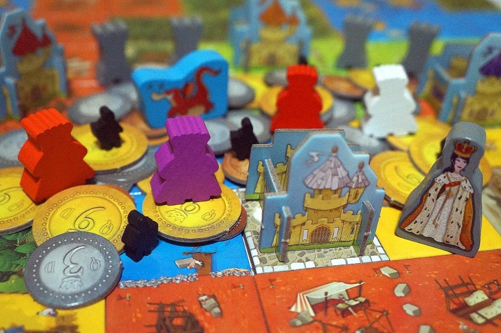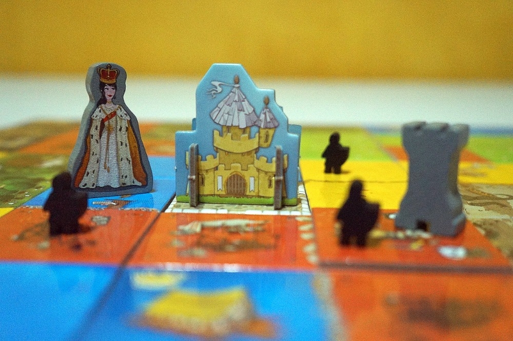 Dominós, castelo em 3D, peça inicial (embaixo do castelo), torre, peça de estabelecimento (embaixo da torre) e cavaleiros. Queendomino