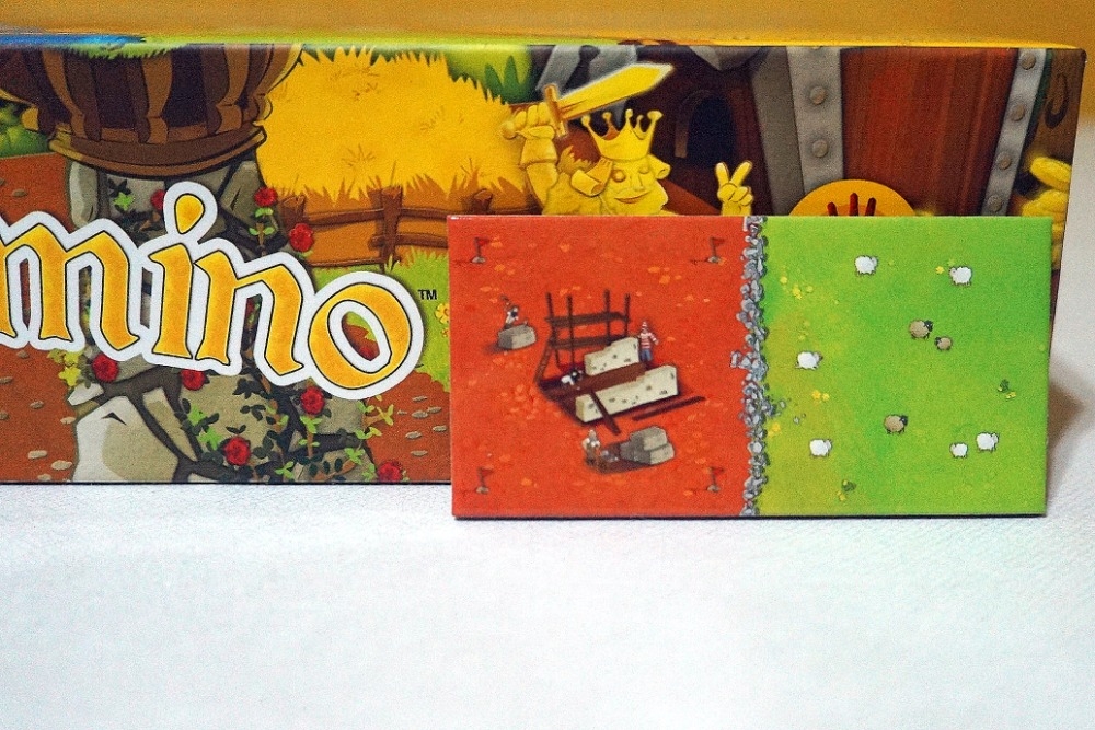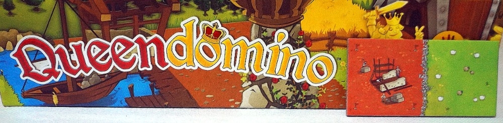 Lateral da caixa do jogo e dominó com Easter Egg do "Onde está Wally?". Queendomino