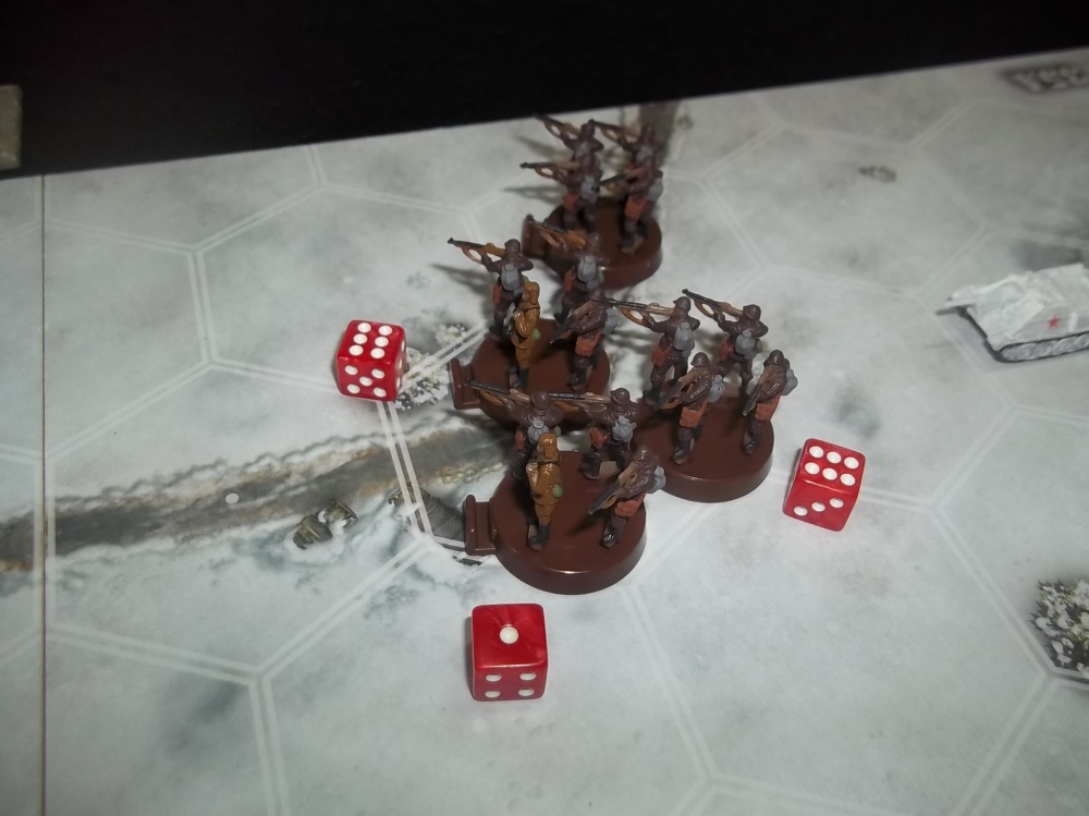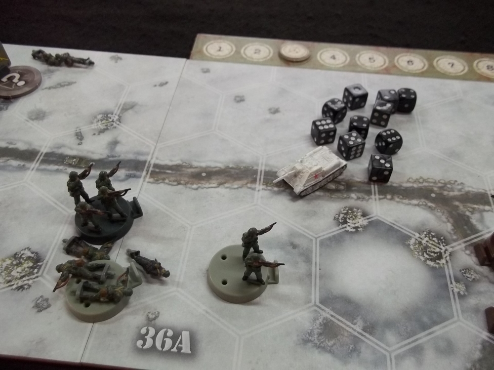 Um colossal SU-122 soviético ataca um pelotão alemão sem cobertura. Lançando 10 dados de ataque acertando no 5 e 6, o resultado é um massacre. Tide of Iron: Fury of the Bear