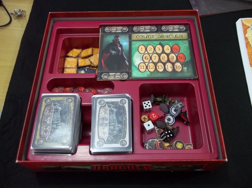 Caixa do jogo com todas as peças acondicionadas. Dispensa a compra de caixinhas plásticas, cabe tudo aqui dentro (mesmo com SLEEVES e tradução ainda cabem, com um pouco de boa vontade). Fury of Dracula (second edition)